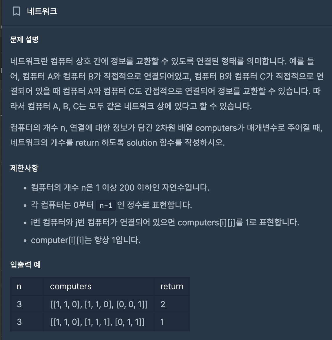즉, "0, 2, 1, 4"와 "3"이 개별 네트워크이므로, 결과 값은 2이다.여기서 중요한 것은 바로, "이전에 확인했는가" 입니다. 중요한 내용이니, 다시 한 번 반복하겠습니다.