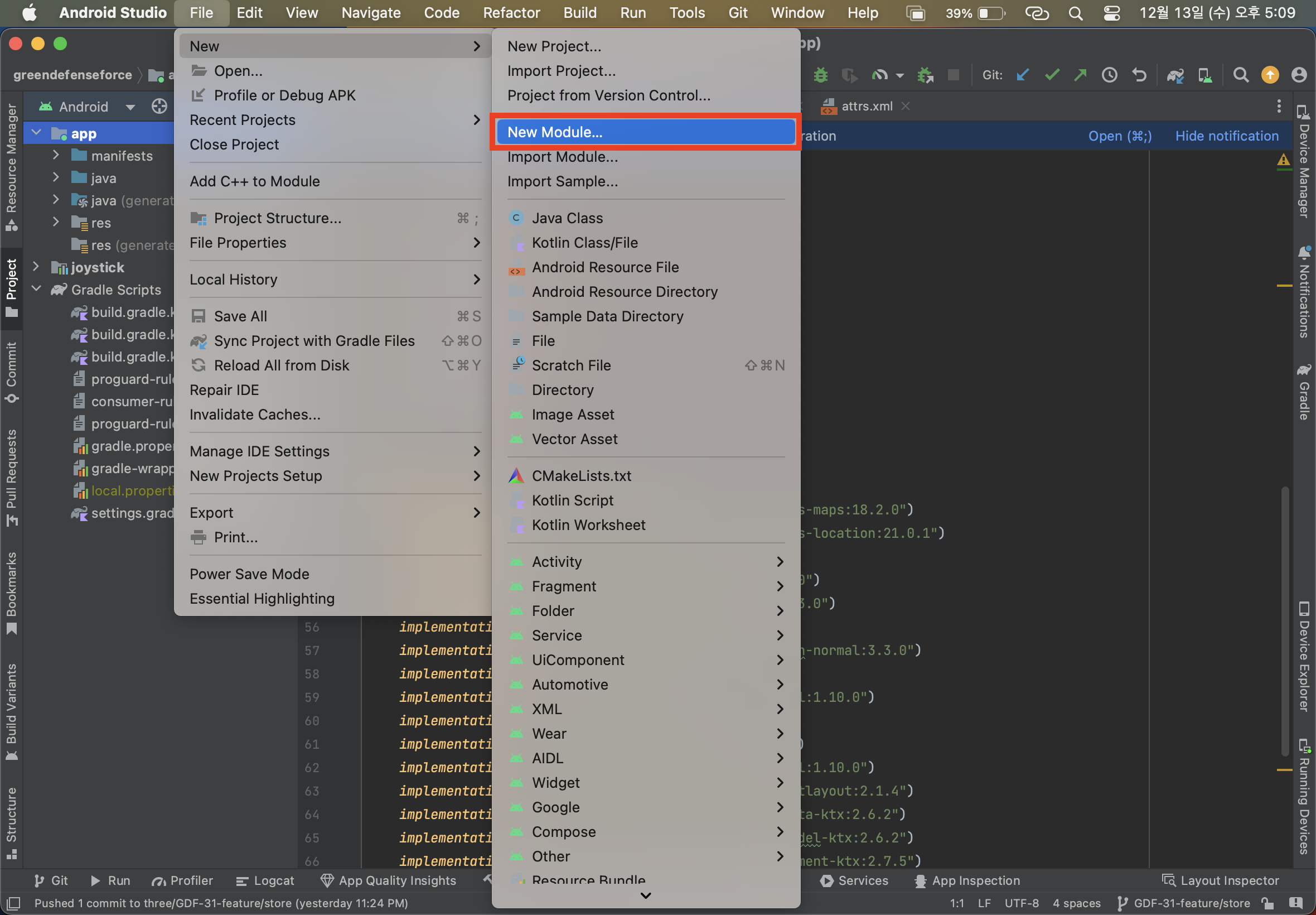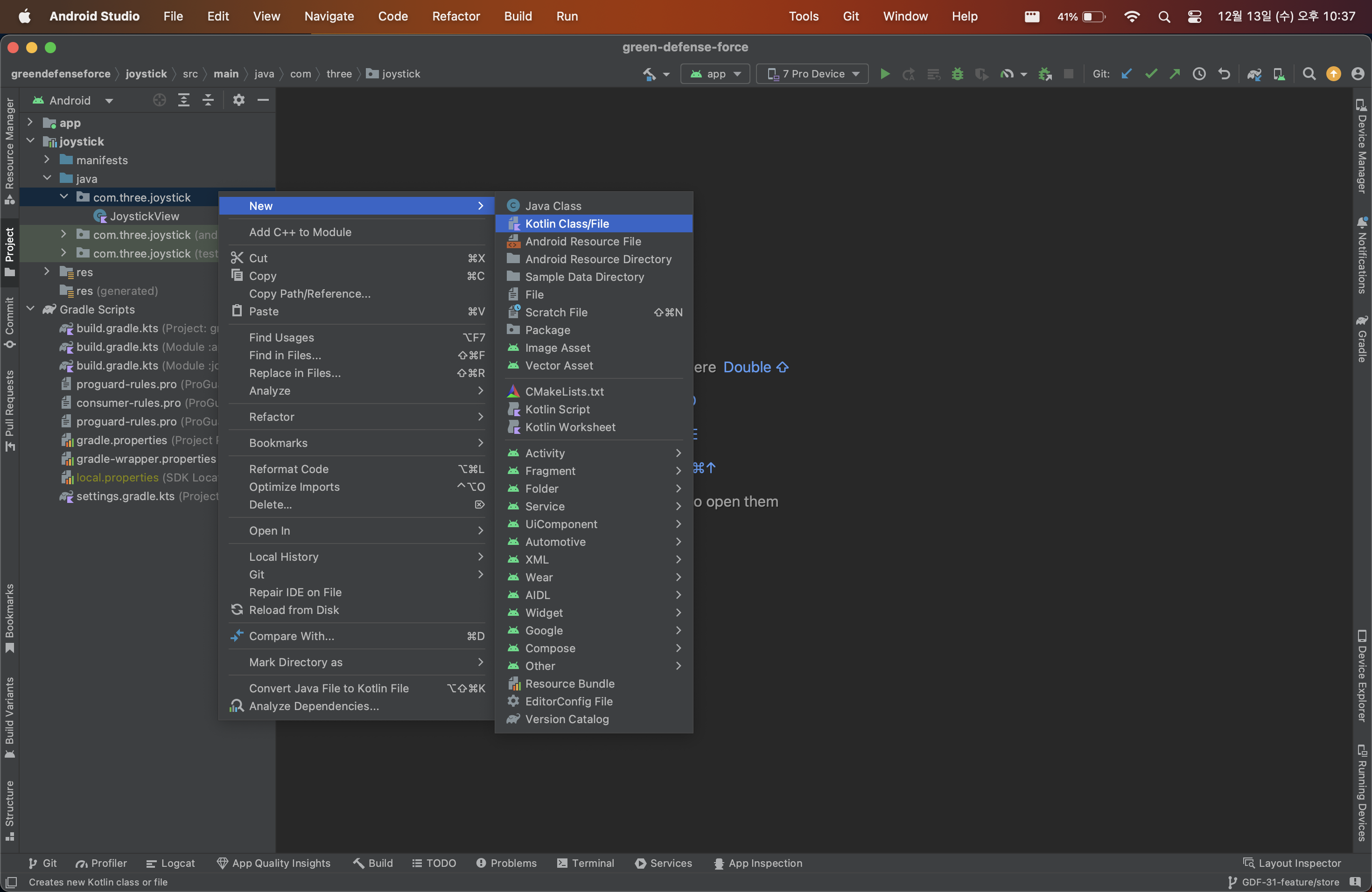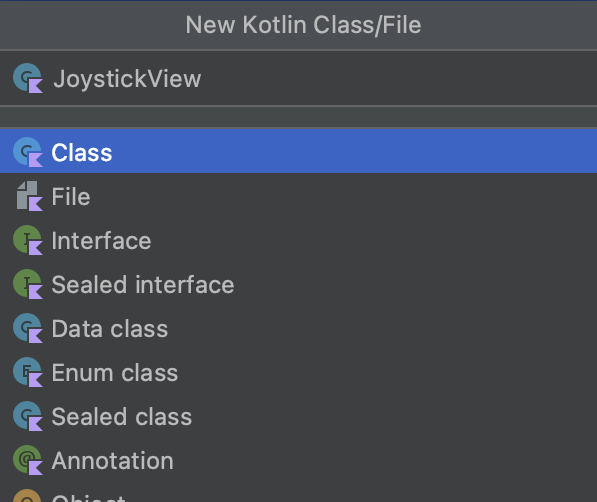 ① joystick → java → com.three.joystick에서 마우스 우클릭 → New → Kotlin Class/File