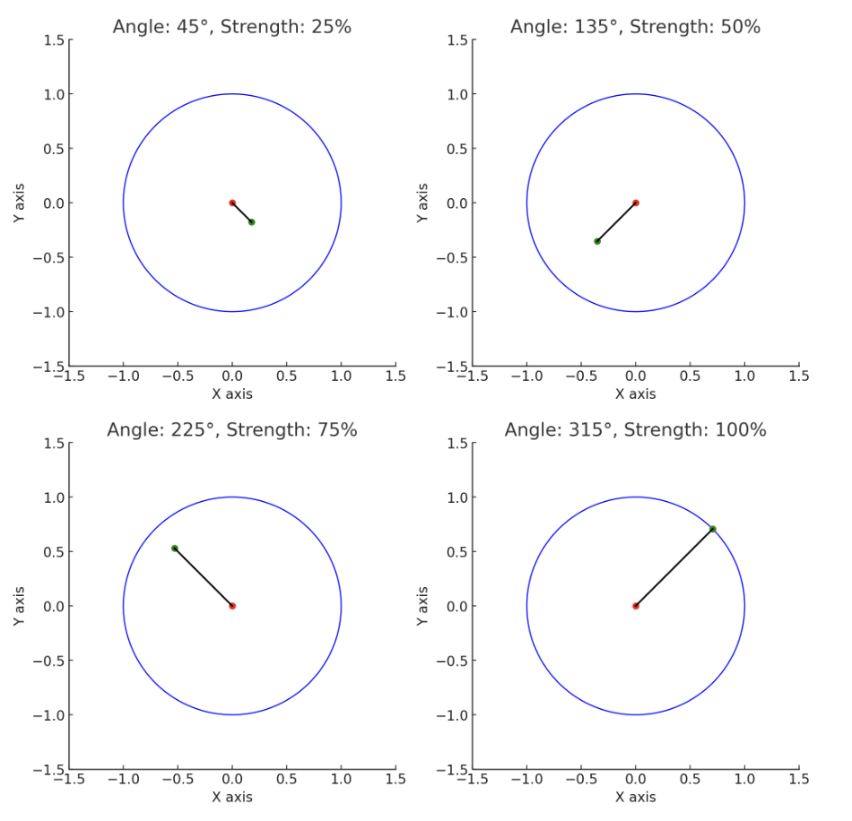 특히, 강도는 조이스틱이 중심으로부터 얼마나 멀리 떨어져 있는지를 통해 나타냅니다.