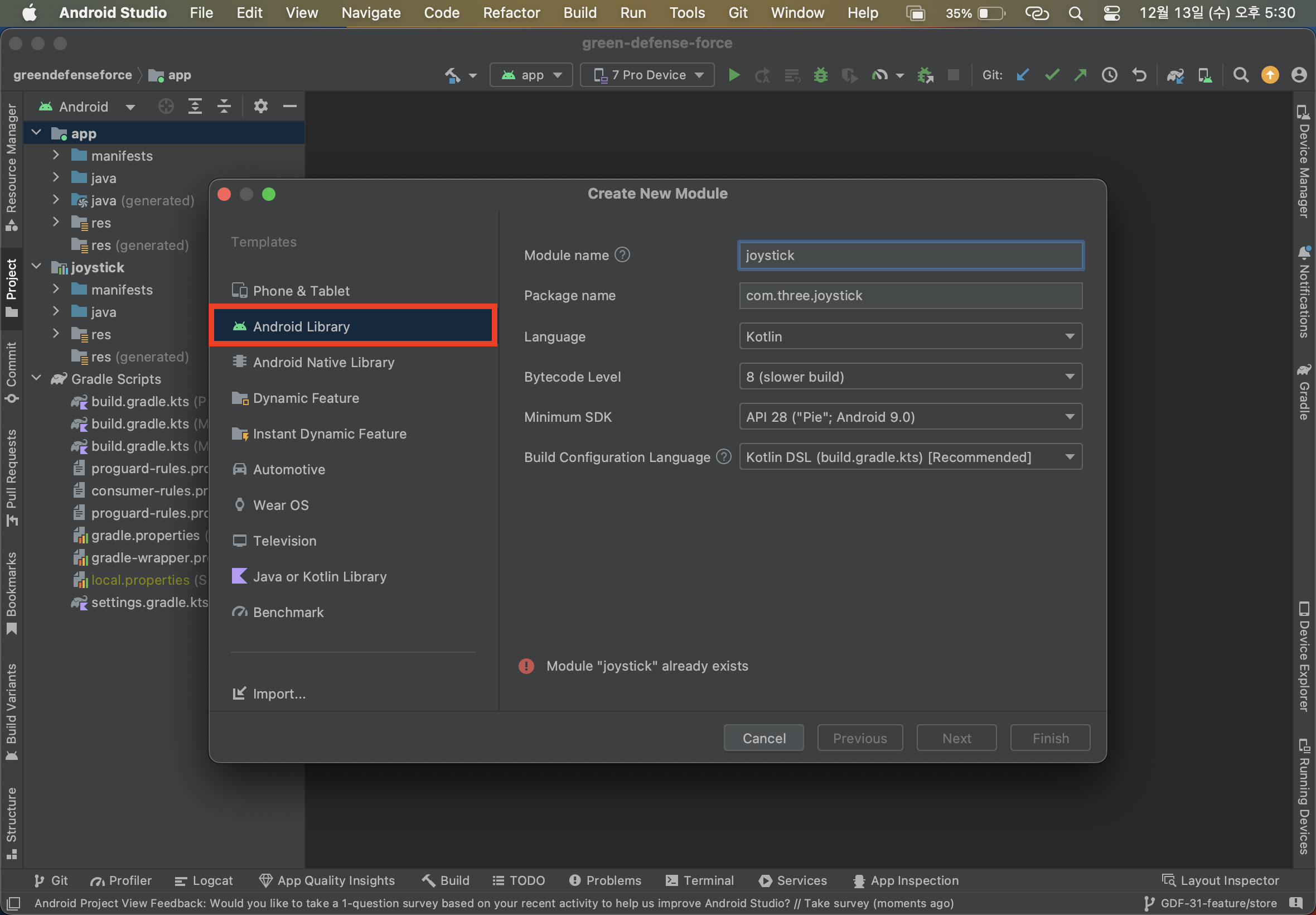 (2) 좌측 메뉴 탭 중 "Android Library" 클릭 및 Module 이름 및 언어, SDK를 설정합니다. (아래와 같이 설정해도 무관)