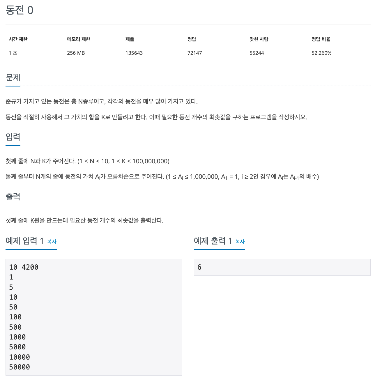 import java.io.BufferedReader import java.io.InputStreamReader fun main() { val br = BufferedReader(InputStreamReader(System.`in`)) val (n, k) = br.readLine().split(" ").map { it.toInt() } val coins = List(n) { br.readLine().toInt() } // 큰 수 순서대로 정렬 val sortedCoins = coins.sortedDescending() // 결과 : 동전 개수 var coinCnt = 0 var remain = k for (coin in sortedCoins) { coinCnt += remain / coin remain %= coin } println(coinCnt) br.close() }🌟 4-1. List(n)을 사용하는 이유는?