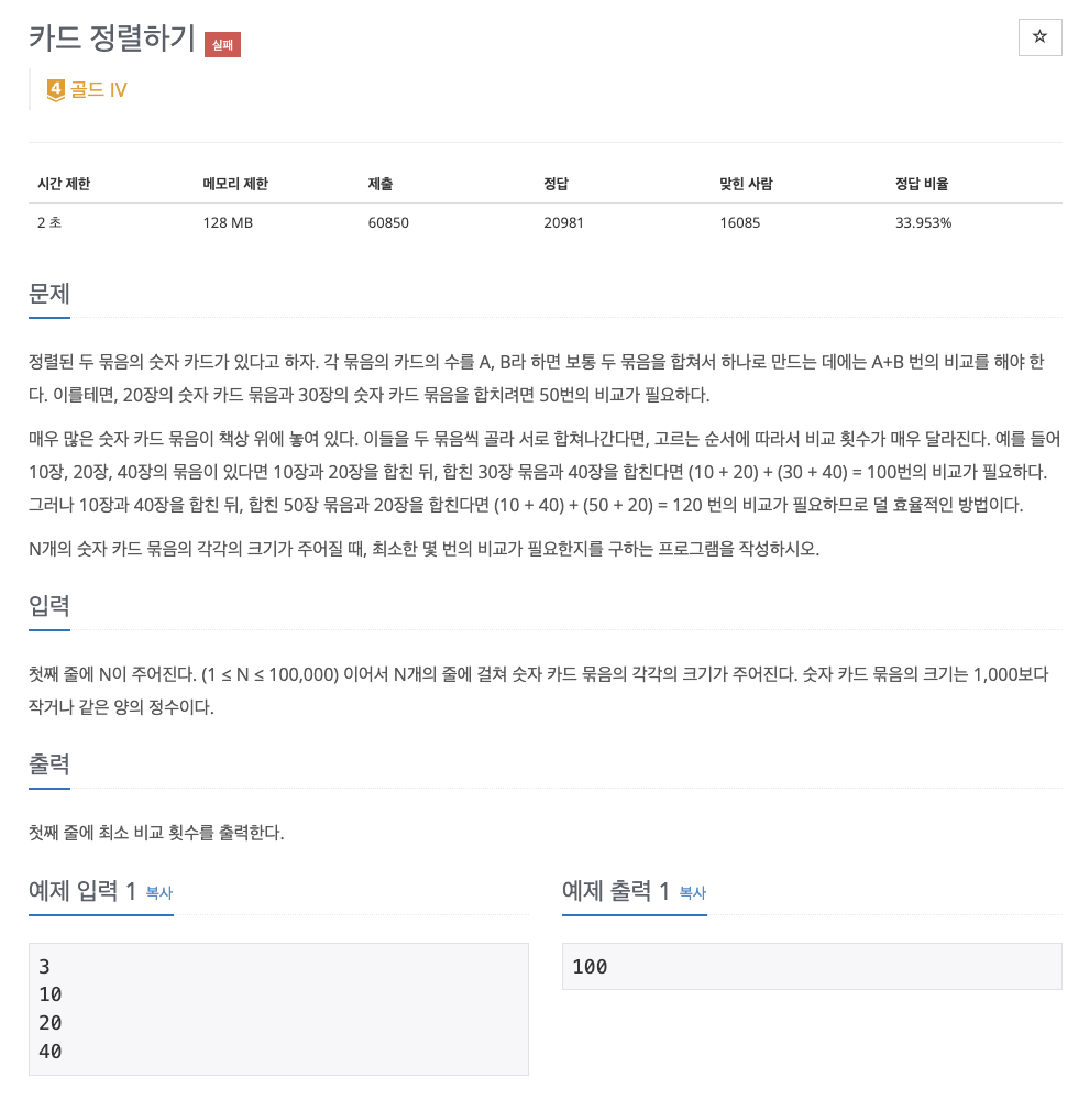 저는 주어진 카드 묶음의 수를 오름차순으로 정렬하고, 앞에 오는 두 수부터 차근차근 더해가면 될 것이라고 생각했습니다.