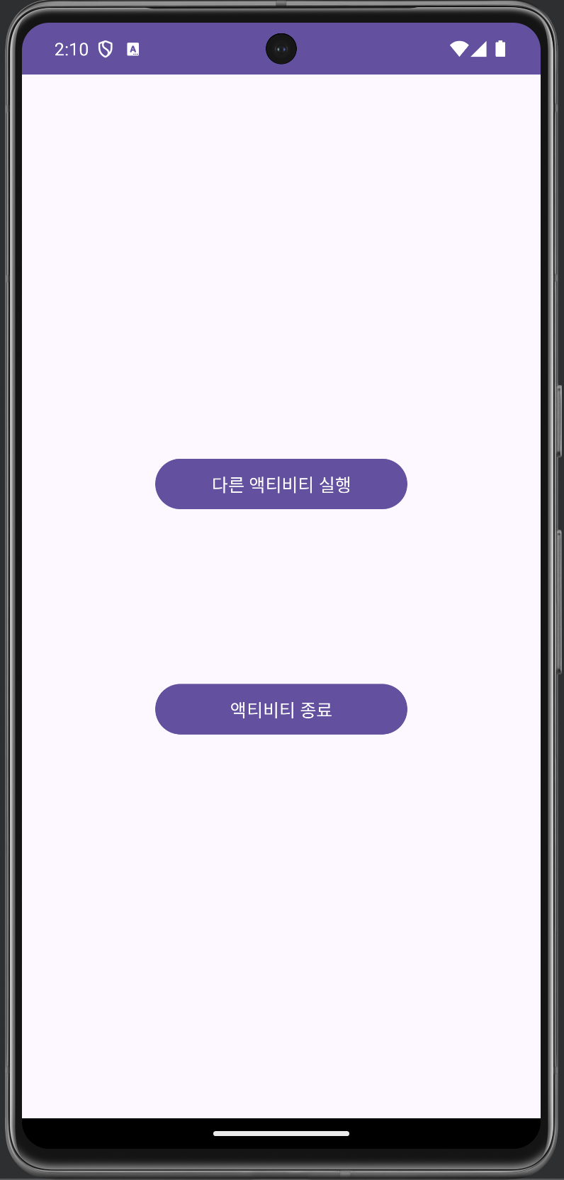 <?xml version="1.0" encoding="utf-8"?> <androidx.constraintlayout.widget.ConstraintLayout xmlns:android="http://schemas.android.com/apk/res/android" xmlns:app="http://schemas.android.com/apk/res-auto" xmlns:tools="http://schemas.android.com/tools" android:layout_width="match_parent" android:layout_height="match_parent" tools:context=".MainActivity"> <Button android:id="@+id/button" android:layout_width="200dp" android:layout_height="wrap_content" android:layout_marginTop="300dp" android:text="다른 액티비티 실행" app:layout_constraintEnd_toEndOf="parent" app:layout_constraintStart_toStartOf="parent" app:layout_constraintTop_toTopOf="parent" /> <Button android:id="@+id/button2" android:layout_width="200dp" android:layout_height="wrap_content" android:layout_marginBottom="300dp" android:text="액티비티 종료" app:layout_constraintBottom_toBottomOf="parent" app:layout_constraintEnd_toEndOf="parent" app:layout_constraintStart_toStartOf="parent" /> </androidx.constraintlayout.widget.ConstraintLayout>