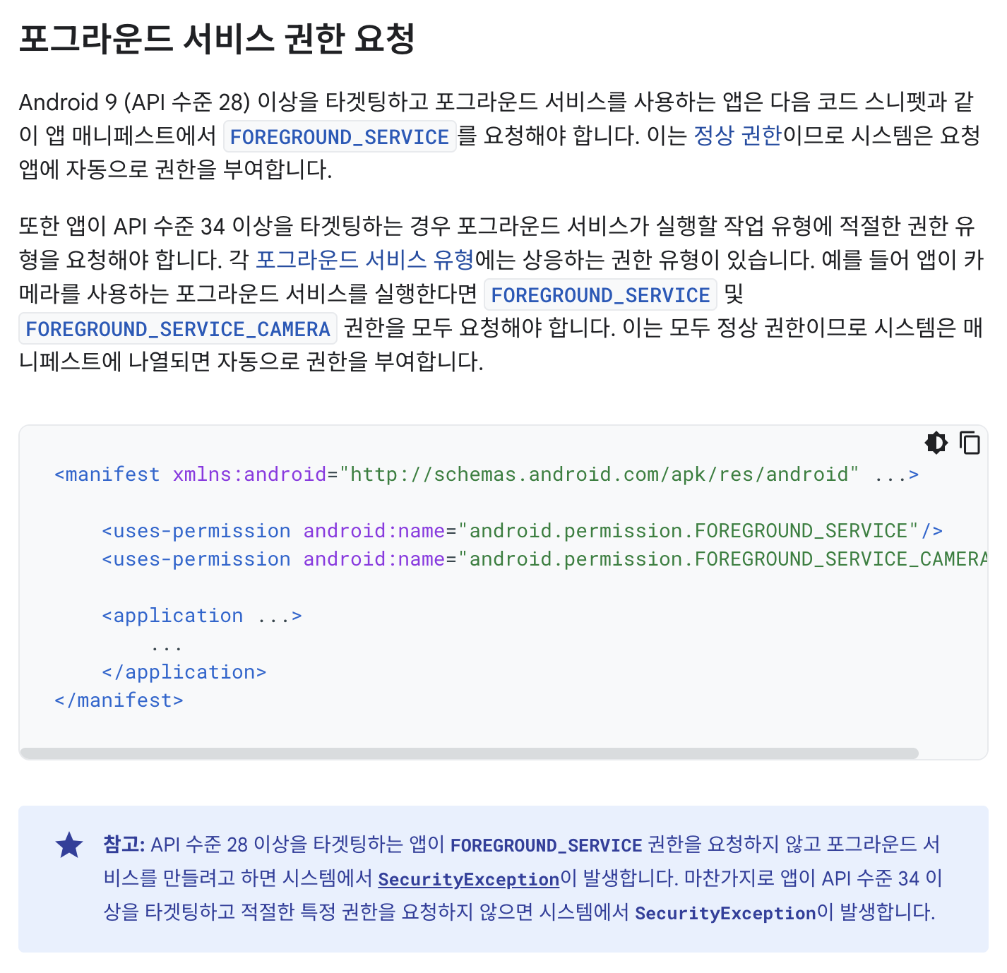 <uses-permission android:name="android.permission.FOREGROUND_SERVICE" />Foreground Service를 사용할 수 있도록 하는 기본 권한입니다.