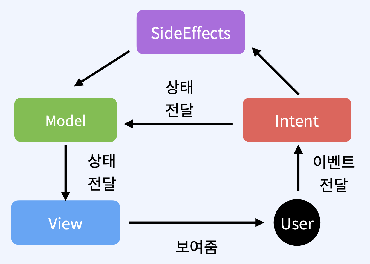 Model์๊ฒ ์ฑ์ ์ํ๋ฅผ ์ ๋ฌํ๋ค. (User๋ ๋ชจ๋ UI ๋ณํ์ ๋ํด Intent๋ฅผ ํตํด ์ด๋ฒคํธ๋ก ์ ๋ฌํ๋ค.)SideEffects