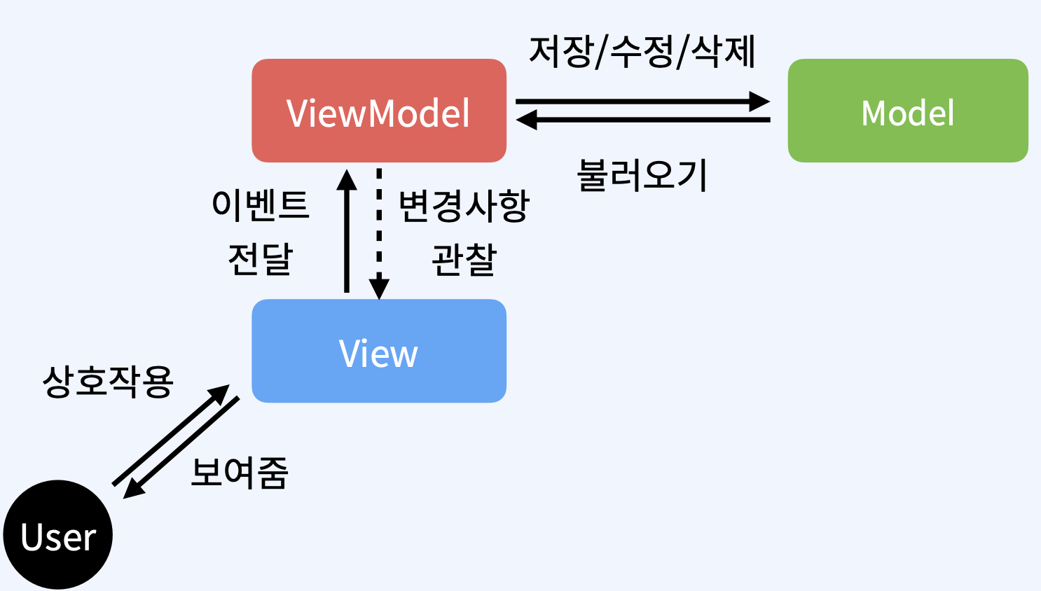 ๋ฐ์ดํฐ๋ฅผ ๊ด์ฐฐํ์ฌ UI๋ฅผ ์ ๋ฐ์ดํธํ ์ ์๋ค. (๋ฐ์ดํฐ์ ๋ณํ๋ฅผ ์์์ฐจ๋ ค, ์๋์ผ๋ก ํ๋ฉด์ ์ ๋ฐ์ดํธํ๋ค.)ViewModel