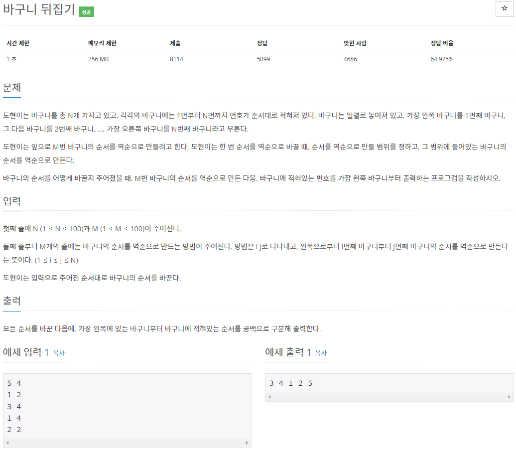 import java.io.BufferedReader; import java.io.BufferedWriter; import java.io.IOException; import java.io.InputStreamReader; import java.io.OutputStreamWriter; import java.util.StringTokenizer; public class Main { public static void main(String[] args) throws IOException { BufferedReader br = new BufferedReader(new InputStreamReader(System.in)); BufferedWriter bw = new BufferedWriter(new OutputStreamWriter(System.out)); StringTokenizer st; st = new StringTokenizer(br.readLine(), " "); int n = Integer.parseInt(st.nextToken()); int m = Integer.parseInt(st.nextToken()); int arr[] = new int[n+1]; int i, j; for(int p = 1; p <= n; p++) { arr[p] = p; } for(int p = 1; p <= m; p++) { st = new StringTokenizer(br.readLine(), " "); i = Integer.parseInt(st.nextToken()); j = Integer.parseInt(st.nextToken()); while(i < j) { // while과 증감연산자를 통해 역순 출력 int temp = arr[i]; arr[i++] = arr[j]; arr[j--] = temp; } } for(int p = 1; p <= n; p++) { bw.write(arr[p] + " "); } br.close(); bw.flush(); bw.close(); } }더 많은 문제들을 풀어보며, 증감연산자(++. --)의 사용에 익숙해져야겠습니다.