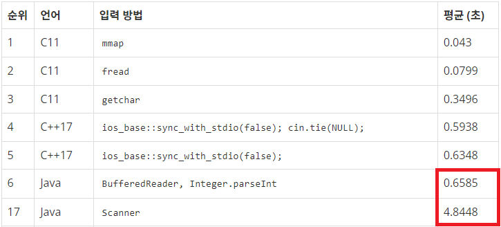 [Java] BufferedReader와 BufferedWriter (입출력 속도)IT Study/컴퓨터 기초 2023. 3. 15. 10:44728x90 백준 알고리즘을 풀며 Scanner와 System.out.println() 사용할 때, 📌 시간 초과가 나는 이유는 무엇일까요?- Java 입력 속도  6위에 자리매김한 BufferedReader와 Integer.parseInt와 비교하여 Scanner를 사용할 때에는 약 7배 정도 느려집니다. - Java 출력 속도  7위에 위치한 BufferedWriter와 bf.write()와 비교하여 System.out.println()의 출력 속도는 약 30배 이상 느리다는 것을 확인할 수 있습니다. 버퍼는 데이터를 전송하는 동안 일시적으로 데이터를 보관하는 임시 메모리 영역으로, 입출력 속도 향상을 위해 사용할 수 있습니다. 이를 위해 우리는 BufferedReader - BufferedWriter를 사용할 수 있어야 합니다. 📌 BufferedReader : 입력 방법BufferedReader br = new BufferedReader(new InputStreamReader(System.in)); 선언 br.readLine() 한 줄 읽어 String 타입으로 변경 br.close() 입력 스트림 닫기 1. 선언 : BufferedReader를 사용하기 위해서는 throws IOException를 통해 예외 처리하는 것이 필수입니다. public class Main { public static void main(String[] args) throws IOException { // 예외 처리 BufferedReader br = new BufferedReader(new InputStreamReader(System.in)); // 선언 } }2. 입력받기 2-1. String 문자열 입력받기 : br.readLine()는 String 타입의 한 줄을 입력받을 수 있습니다. String s = br.readLine();2-2. int 정수 입력받기 : Integer.parseInt()를 통해 문자열을 정수로 변환할 수 있습니다. int i = Integer.parseInt(br.readLine());2-3. 입력받은 문자열에 공란(" ") 존재 시, 공란으로 구분하여 데이터 사용하기 2-3-1. StringTokenizer 사용 StringTokenizer st = new StringTokenizer(br.readLine(), " "); // StringTokenizer(br.readLine(), " ") : 입력받은 문자열 br.readLine()을 구분자 공란(" ")으로 분리하여 Token st에 저장 // StringTokenizer(String str,String delim) : 주어진 문자열 str을 구분자 delim으로 분리하여 Token st에 저장2-3-2. String과 split String str = br.readLine(); String arr[] = str.split(" "); // 입력받은 문자열 str을 공란(" ")으로 분리하여 배열 arr[]에 저장3. 입력 스트림 닫기 : 더 이상 입력받지 않는다면 입력 스트림을 닫아줍니다. br.close();📌 BufferedWriter : 출력 방법BufferedWriter bw = new BufferedWriter(new OutputStreamWriter(System.out)); 선언 bw.write() 출력할 내용 담기 (출력 X) bw.flush() 출력과 동시에 버퍼 비우기 bw.close() 출력 스트림 닫기 1. 선언 : BufferedWriter를 사용하기 위해서는 throws IOException를 통해 예외 처리하는 것이 필수입니다. public class Main { public static void main(String[] args) throws IOException { // 예외 처리 BufferedWriter bw = new BufferedWriter(new OutputStreamWriter(System.out)); // 선언 } }2. 출력과 출력 스트림 닫기 String s = "Hello"; // 출력할 문자열 bw.write(s + "\n"); // 출력할 내용 담기 bw.flush(); // 출력과 동시에 버퍼 비우기 bw.close(); // 출력 스트림 닫기백준 알고리즘을 풀어보며.. 처음엔 풀이하는 데에만 집중했지만 시간이 갈수록 시간과 메모리를 단축하는 데에 욕심이 생기는 것 같아요! 이를 위해서는 반드시 BufferedReader와 BufferedWriter을 알고 있어야 할 것 같습니다. 이해되지 않는 부분이 있다면 댓글 남겨주세요 :) 참고(도움을 아주 많이 받은) 사이트 :