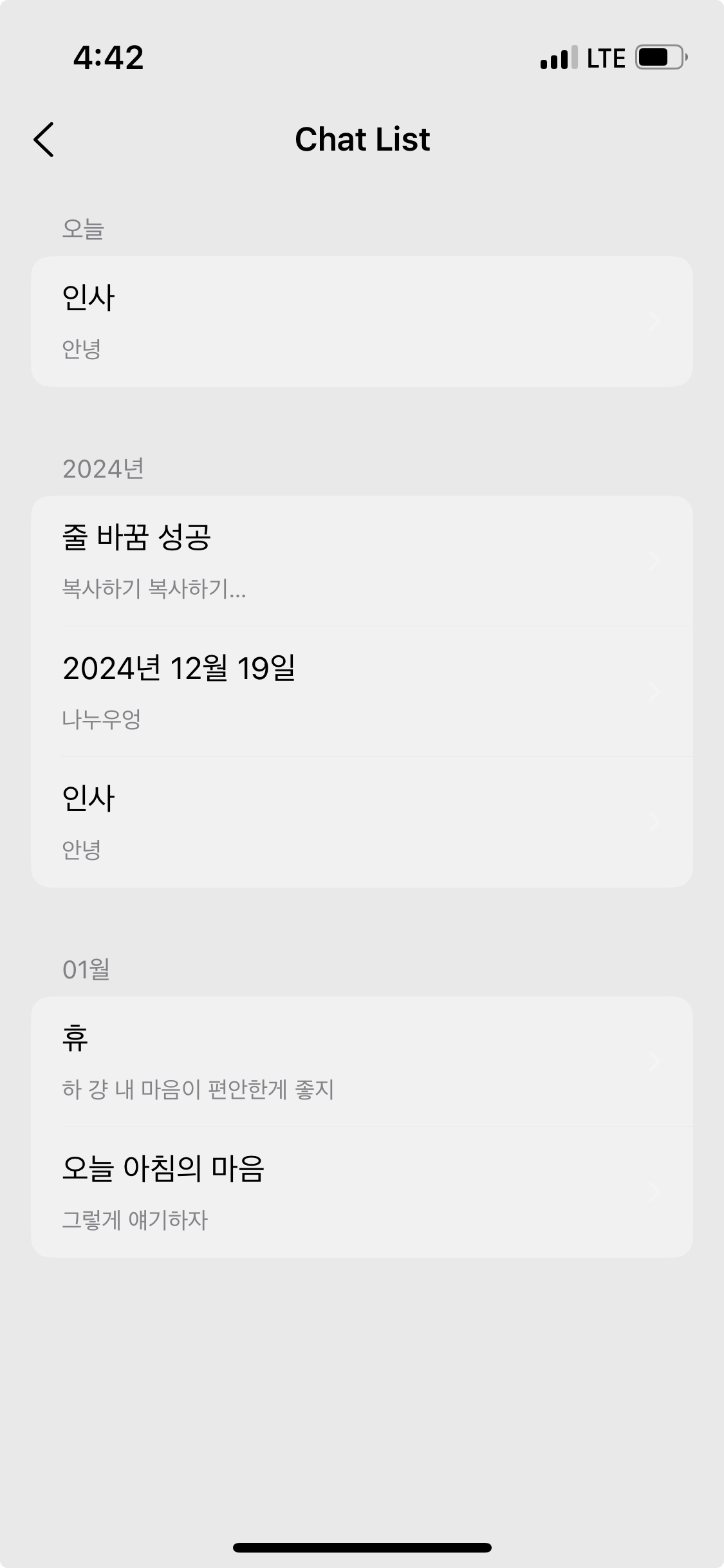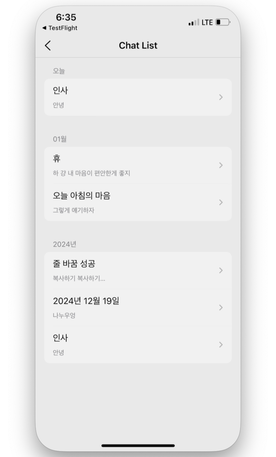 AloneChat에는 채팅 목록을 날짜별로 그룹화하는 기능이 있습니다. 이 기능은 2024년 연말까지는 문제없는 듯 보였지만, 2025년 새해가 되면서(ㅋㅋ ㅠㅠ 바보...) 2024년 그룹이 2025년 1월보다 위에 표시되는 문제가 발생하였습니다.