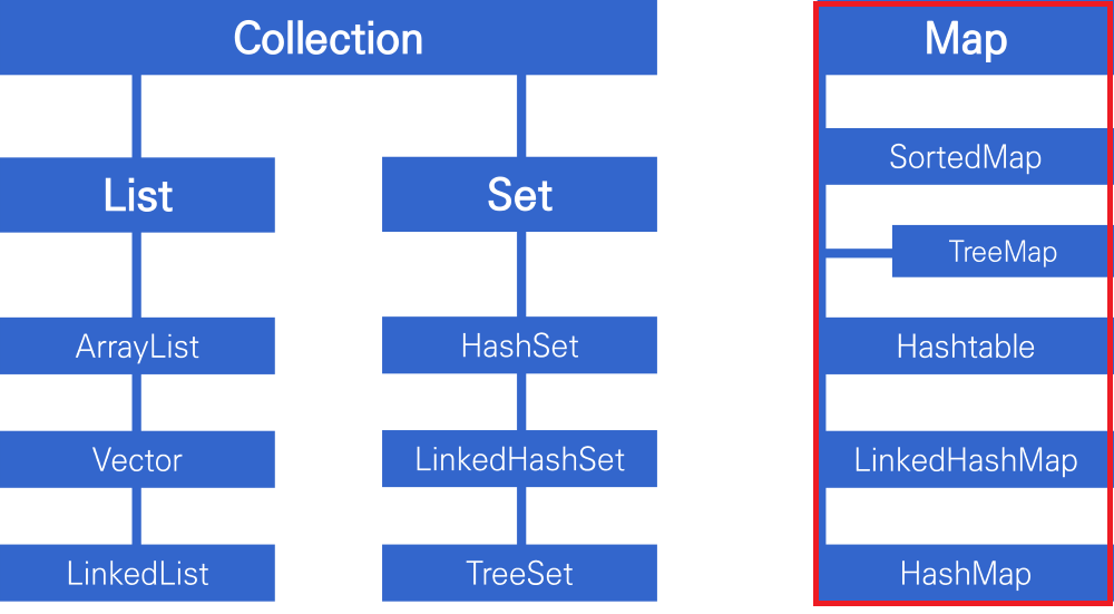 Map 인터페이스는 키-값 쌍의 데이터를 저장하는 컬렉션 프레임워크입니다.