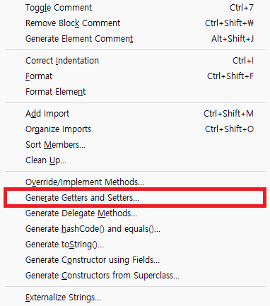 eclipse(통합개발환경, IDE)에서는 Getter/Setter를 부르기 위해서는 'shift + alt + s' 단축키를 사용합니다.