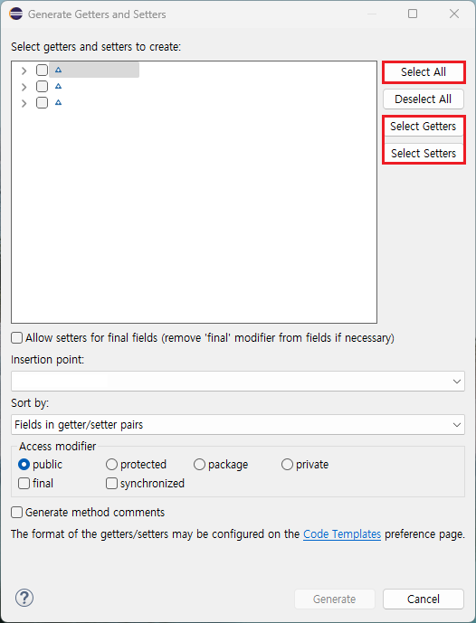 Select Getters/Setters : Getter/Setter 생성학생 정보를 저장하는 클래스를 예시로, 학생의 이름, 학번, 전공을 멤버 변수로 생성하였습니다.