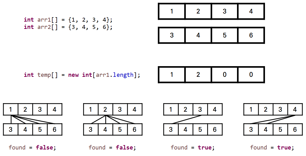 // 임시 배열 생성 int temp[] = new int[arr1.length]; // 임시 배열의 인덱스 생성 int index = 0; for(int i : arr1) { // 같은지 다른지 boolean found = false; for(int j : arr2) { if(i == j) { found = true; break; } } if(!found) { temp[index] = i; index++; } }