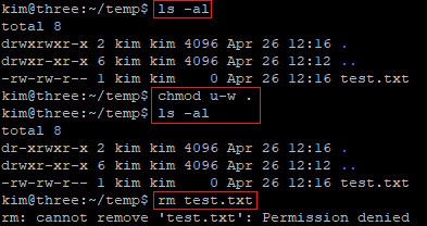 디렉터리에 대한 w 권한을 설정하지 않을 경우에는 디렉터리 내에 존재하는 어떠한 파일도 삭제할 수 없습니다.