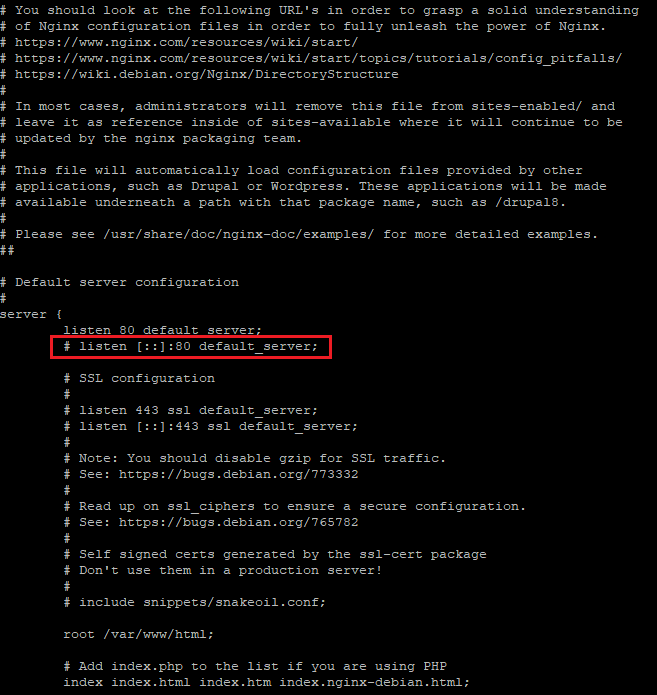 listen [::]:80 default_server는 IPv6 주소를 통해 들어오는 모든 HTTP 요청을 처리하도록 nginx를 구성합니다.