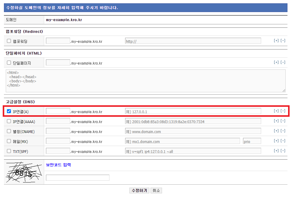 아래와 같은 DNS 설정 페이지에서 A 또는 CNAME 레코드를 추가하여 도메인을 웹 서버의 IP 주소와 연결합니다.