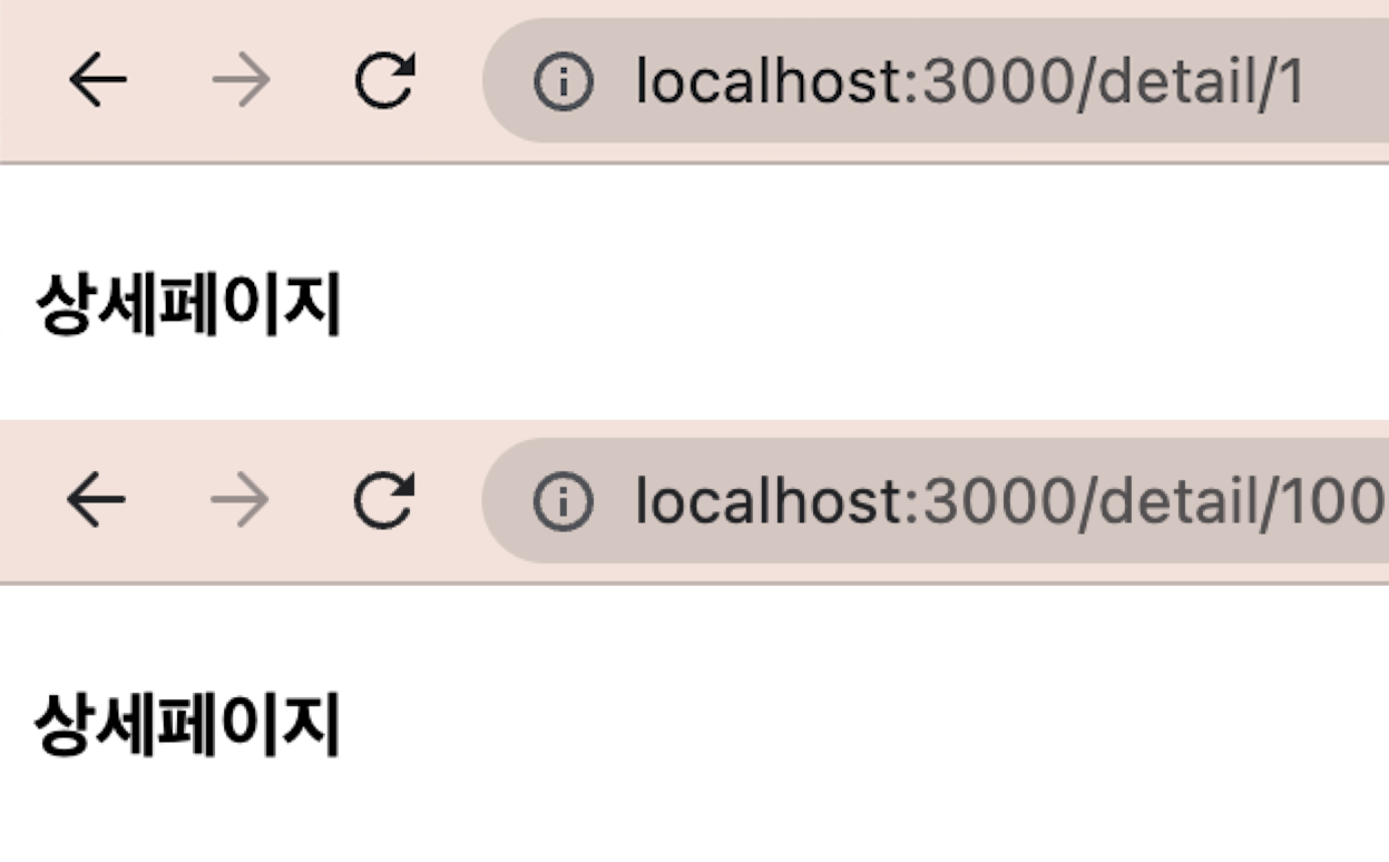 아래와 같이 /detail/1, detail/100으로 접속해도 같은 내용의 page.js이 렌더링 됩니다.