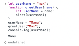 let userName = "max"; function greetUser(name) { // 함수 내부에서의 userName이 매개변수 name으로 섀도잉 let userName = name; alert(userName); } // 전역 범위에서의 userName을 "Manu"로 변경 userName = "Manu"; // 함수 호출, 알림창에는 "Max"가 표시 greetUser("Max"); // 전역 범위의 userName을 출력, 콘솔에는 "Manu"가 출력 console.log(userName);