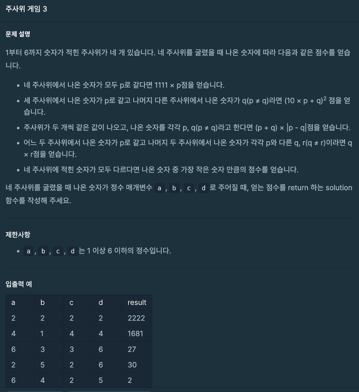 function solution(a, b, c, d) { var answer = 0; return answer; }결과 코드
