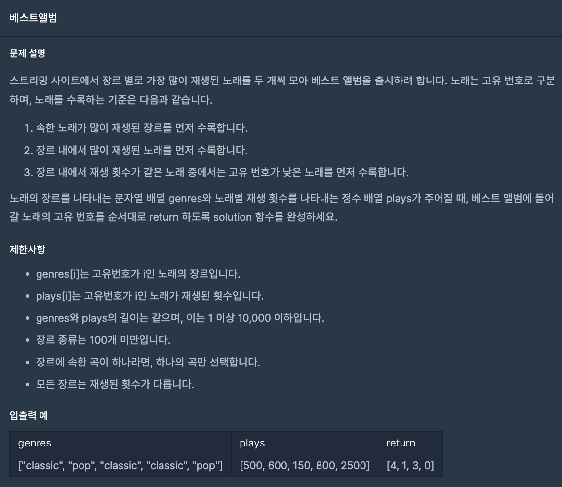 function solution(genres, plays) { // 베스트 앨범에 들어갈 노래의 고유 번호를 저장하는 Array let answer = []; // 장르 별 총 재생 수를 나타내는 Map let genreTotalPlayMap = new Map(); for (let i = 0; i < genres.length; i++) { const genre = genres[i]; const play = plays[i]; if (genreTotalPlayMap.has(genre)) { genreTotalPlayMap.set(genre, genreTotalPlayMap.get(genre) + play); } else { genreTotalPlayMap.set(genre, play); } } // 장르별 재생 수 높은 순으로 나타내기 위한 Array let genreTotalPlayArray = Array.from(genreTotalPlayMap); genreTotalPlayArray.sort((a, b) => { if (a[1] > b[1]) { return -1; } if (a[1] < b[1]) { return 1; } return 0; }); // 장르별 재생 수를 나타내는 Map let genrePlayMap = new Map(); for (let i = 0; i < genres.length; i++) { const genre = genres[i]; const play = plays[i]; if (genrePlayMap.has(genre)) { const playData = genrePlayMap.get(genre); playData.push({play: play, index: i}); playData.sort((a, b) => { if (a.play > b.play) { return -1; } if (a.play < b.play) { return 1; } return; }) genrePlayMap.set(genre, playData); } else { genrePlayMap.set(genre, [{play: play, index: i}]); } } // 상위 2개 노래를 나타내어 담기 for (let genre of genreTotalPlayArray) { const data = genrePlayMap.get(genre[0]); answer.push(data[0].index, data[1].index); } return answer; }코드가 많이 길죠...