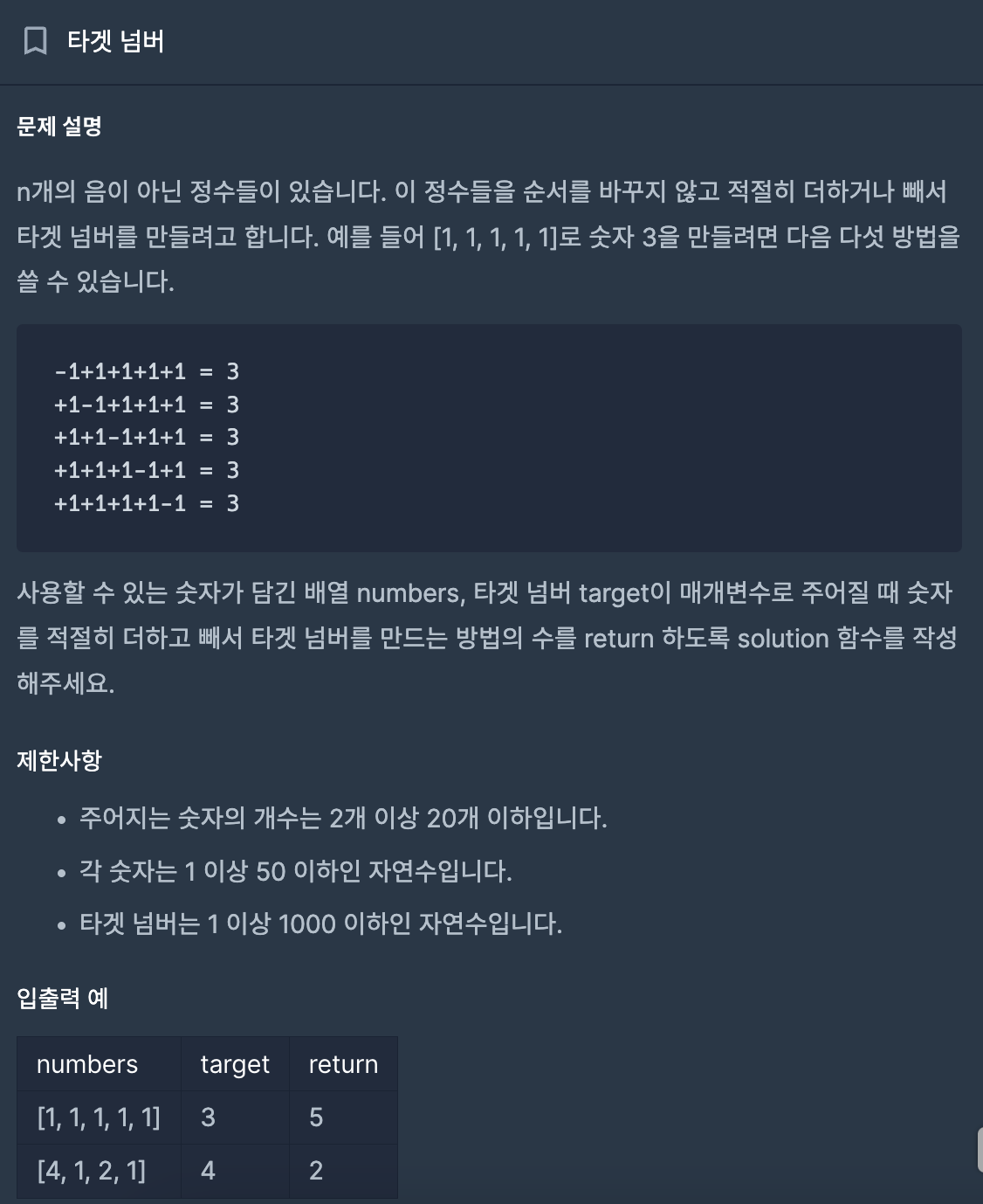 function solution(numbers, target) { var answer = 0; // 1. total (numbers 합계) 구하기 const total = numbers.reduce((accVal, curVal) => { return accVal + curVal; }) // 2. purpose ((total - target) / 2) 구하기 const purpose = (total - target) / 2; // 3. numbers 내에서 합이 purpose인 배열의 개수 구하기 return answer; }여기까지가 제가 들이댄 코드입니다.