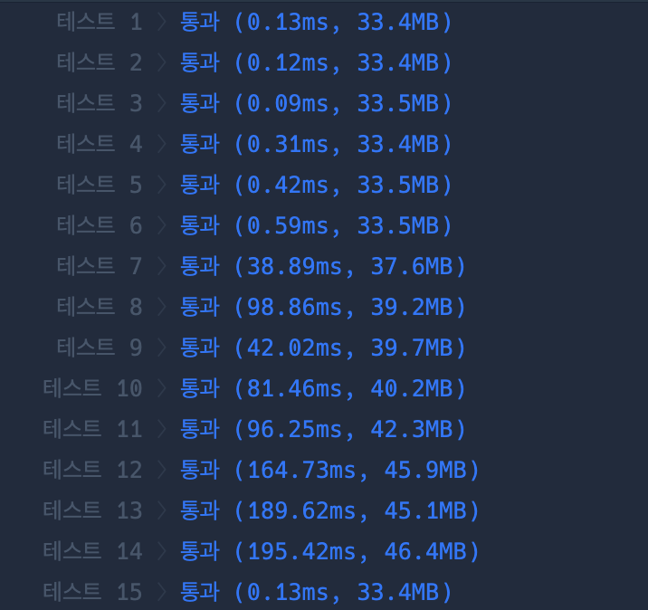 function solution(s) { var answer = []; // 1. {{ }} 맨 앞/뒤 중괄호 2개 빼기 const sLength = s.length; const s1 = s.slice(2, sLength - 2); // 2. '{' 빼기 const s2 = s1.replaceAll("{", ""); // 3. ,(콤마) 기준 자르고 배열에 담기 const arr = s2.split("},"); // 4. 배열 안의 배열로 만들기 let arrInArr = []; for (let i = 0; i < arr.length; i++) { const item = arr[i]; arrInArr.push(item.split(",")); } // 5. 각 요소 길이 순으로 나열하기 const sortArr = arrInArr.sort((x, y) => x.length - y.length) // 6. 배열 돌며 answer에 push() let beforeArr = []; for (let i = 0; i < sortArr.length; i++) { const item = sortArr[i]; const pushItem = item.filter(x => !beforeArr.includes(x)).join(); answer.push(+pushItem); beforeArr = item; } return answer; }🧪 3. 테스트 결과